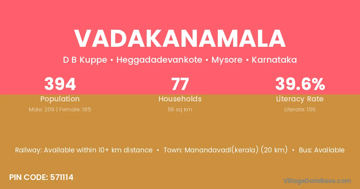 Manandavadi(kerala) (20 km) is the nearest town to Vadakanamala village for major economic activities and is located approximately 20 km away.