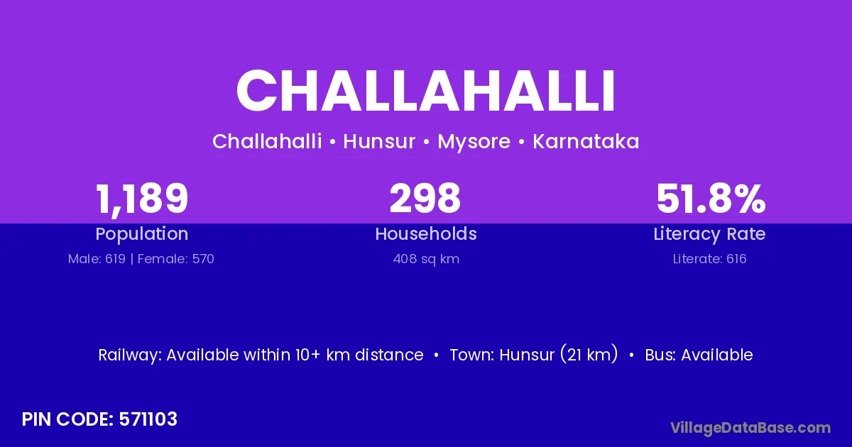 Hunsur (21 km) is the nearest town to Challahalli village for major economic activities and is located approximately 21 km away.
