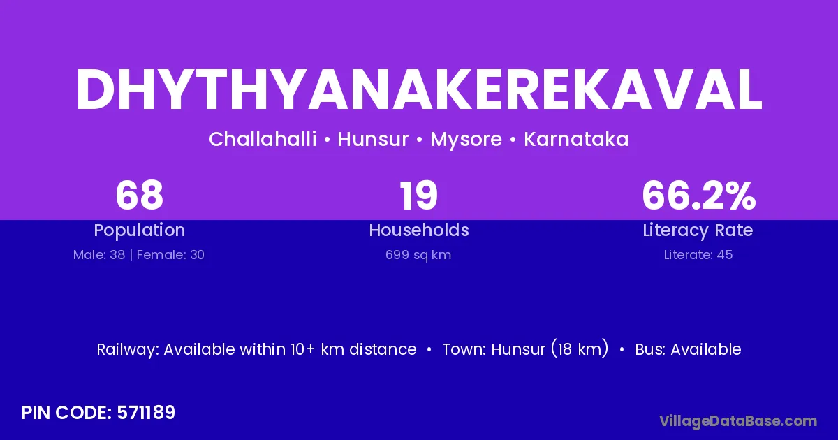 Hunsur (18 km) is the nearest town to Dhythyanakerekaval village for major economic activities and is located approximately 18 km away.