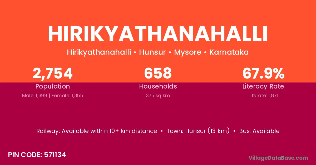 Hunsur (13 km) is the nearest town to Hirikyathanahalli village for major economic activities and is located approximately 13 km away.