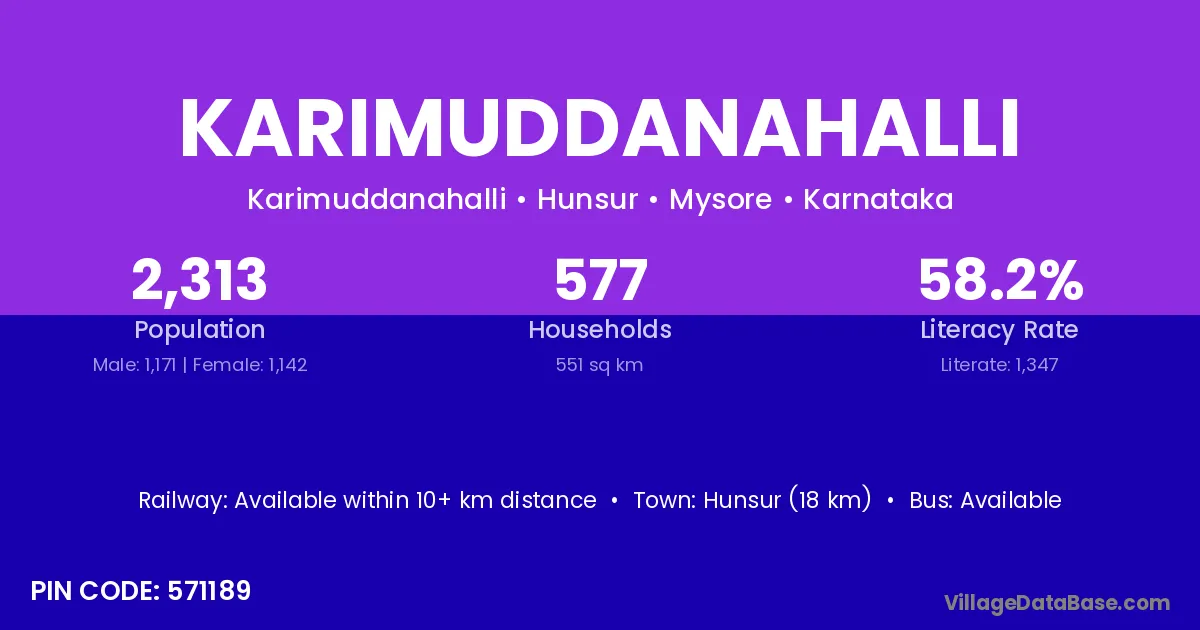 Hunsur (18 km) is the nearest town to Karimuddanahalli village for major economic activities and is located approximately 18 km away.