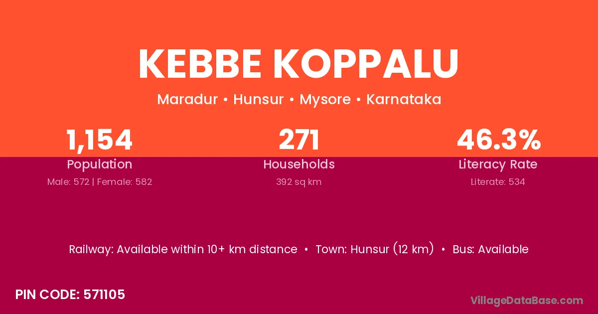 Kebbe Koppalu village has a total population of 1,154 people, of which 572 are males and 582 are females.