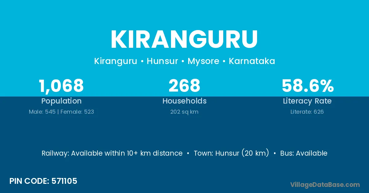 Hunsur (20 km) is the nearest town to Kiranguru village for major economic activities and is located approximately 20 km away.