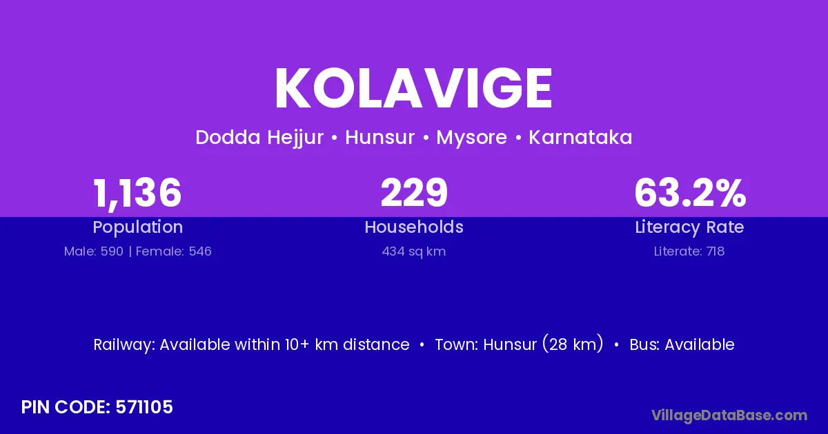 Hunsur (28 km) is the nearest town to Kolavige village for major economic activities and is located approximately 28 km away.