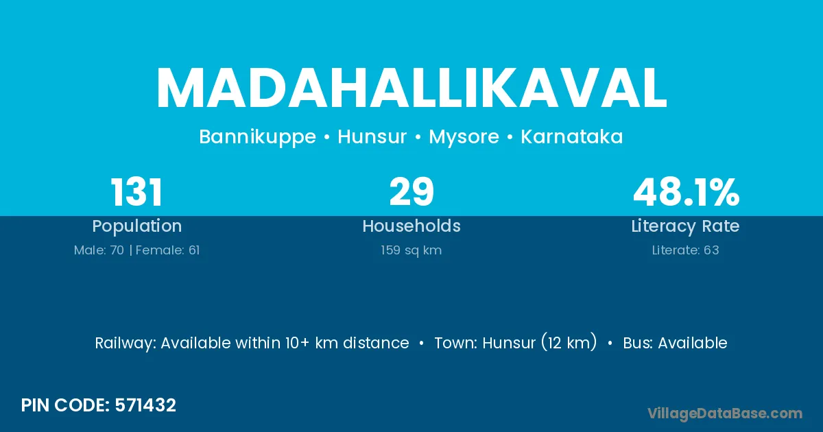 Hunsur (12 km) is the nearest town to Madahallikaval village for major economic activities and is located approximately 12 km away.