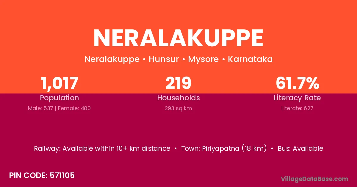Neralakuppe village has a total population of 1,017 people, of which 537 are males and 480 are females.