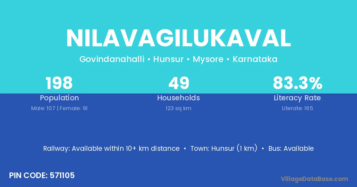 Hunsur (1 km) is the nearest town to Nilavagilukaval village for major economic activities and is located approximately 1 km away.