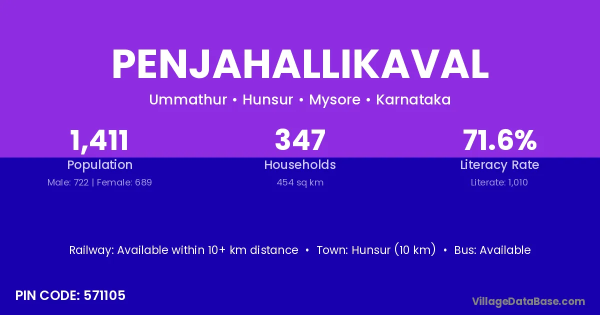 Hunsur (10 km) is the nearest town to Penjahallikaval village for major economic activities and is located approximately 10 km away.