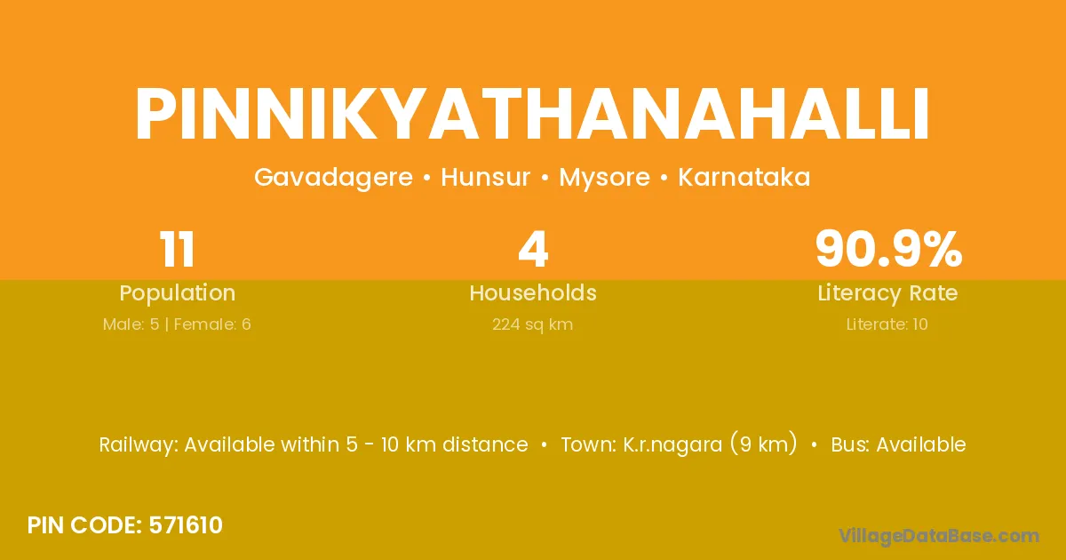 Pinnikyathanahalli village has a total population of 11 people, of which 5 are males and 6 are females.