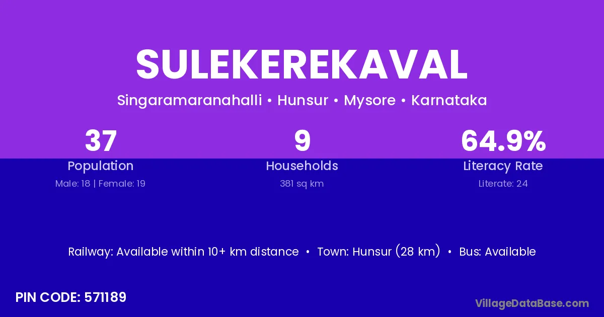 Hunsur (28 km) is the nearest town to Sulekerekaval village for major economic activities and is located approximately 28 km away.