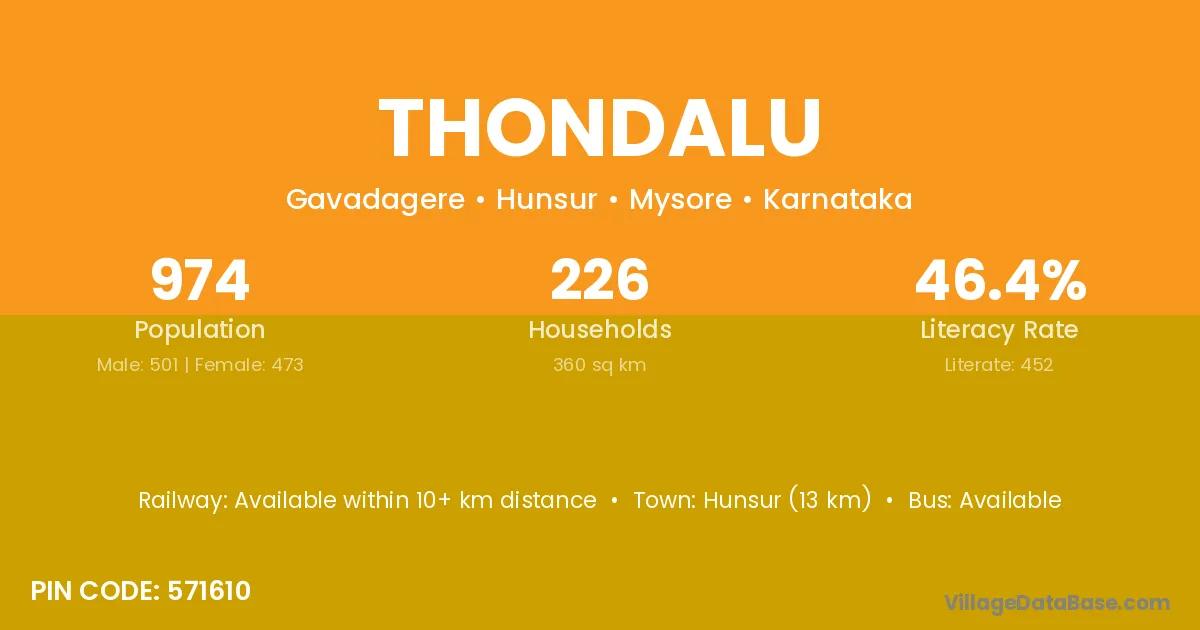 Hunsur (13 km) is the nearest town to Thondalu village for major economic activities and is located approximately 13 km away.