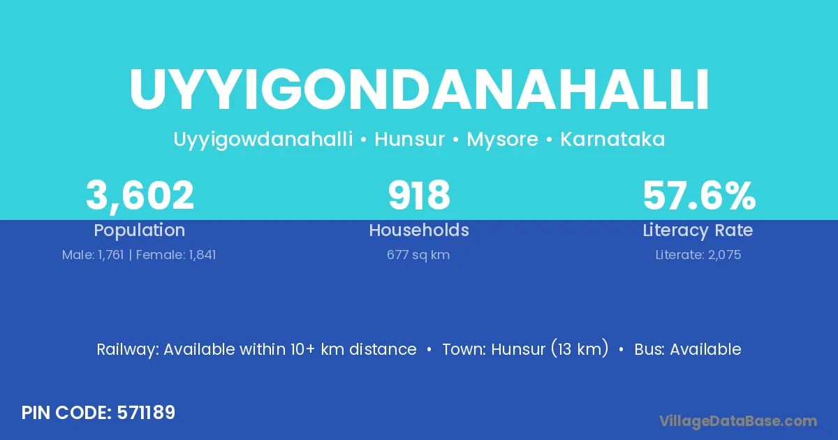 Hunsur (13 km) is the nearest town to Uyyigondanahalli village for major economic activities and is located approximately 13 km away.