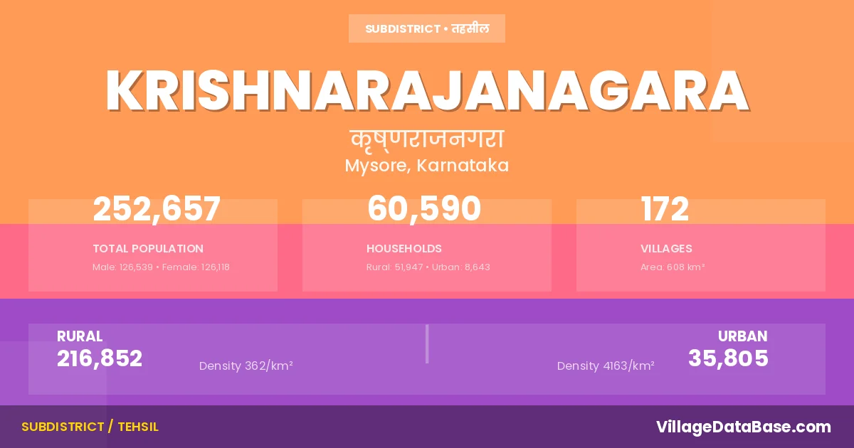 According to the 2011 census The total area of Krishnarajanagara Taluka is 608 km², with a population of 252657 people. The population density is 416 inhabitants per square kilometre, and there are approximately 60590 houses in the sub district.