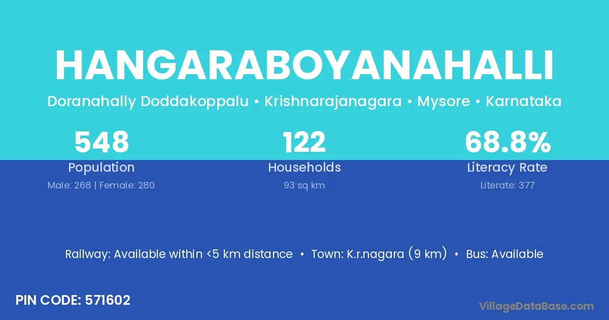 K.r.nagara (9 km) is the nearest town to Hangaraboyanahalli village for major economic activities and is located approximately 9 km away.