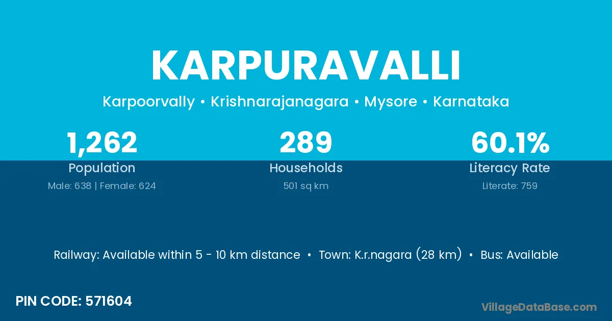 Karpuravalli village has a total population of 1,262 people, of which 638 are males and 624 are females.
