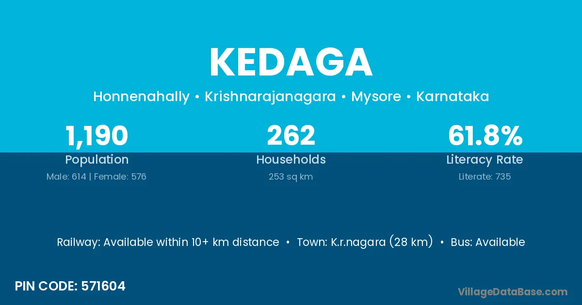 Kedaga village has a total population of 1,190 people, of which 614 are males and 576 are females.