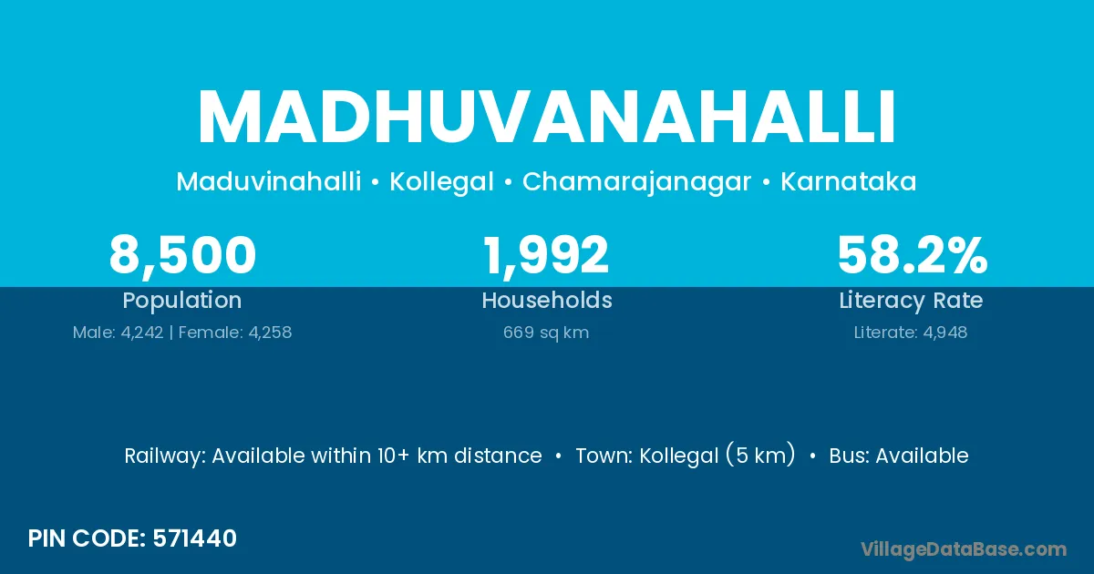 The literacy rate of Madhuvanahalli village is 70.59%. Male literacy stands at 75.00% and female literacy at 66.67%.
