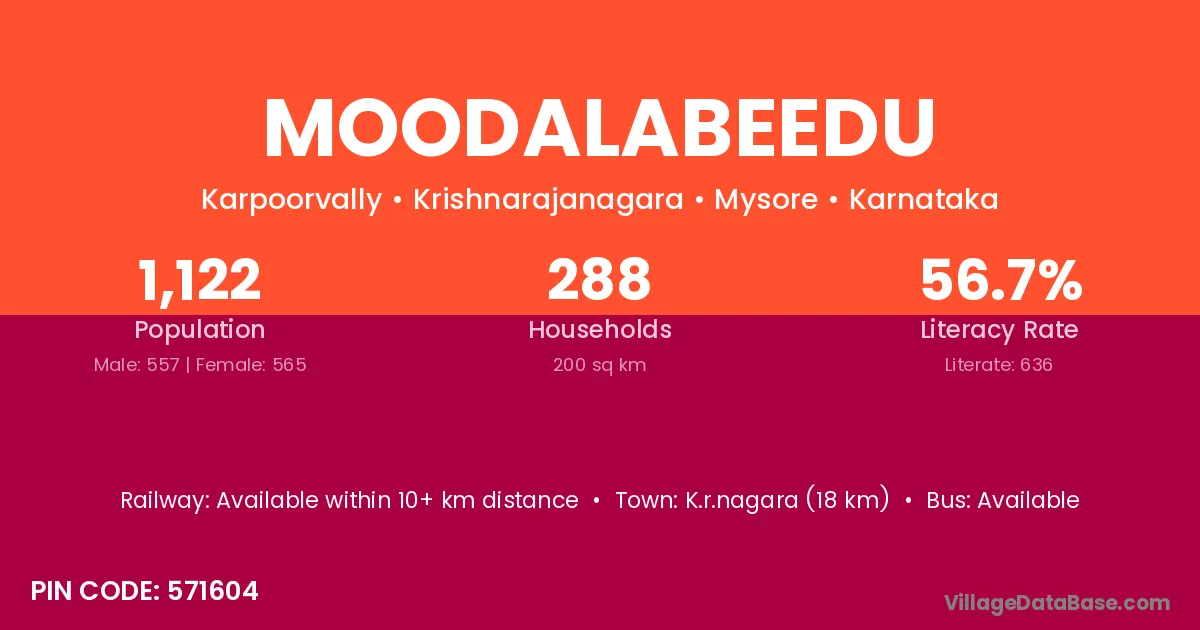 Moodalabeedu village has a total population of 1,122 people, of which 557 are males and 565 are females.