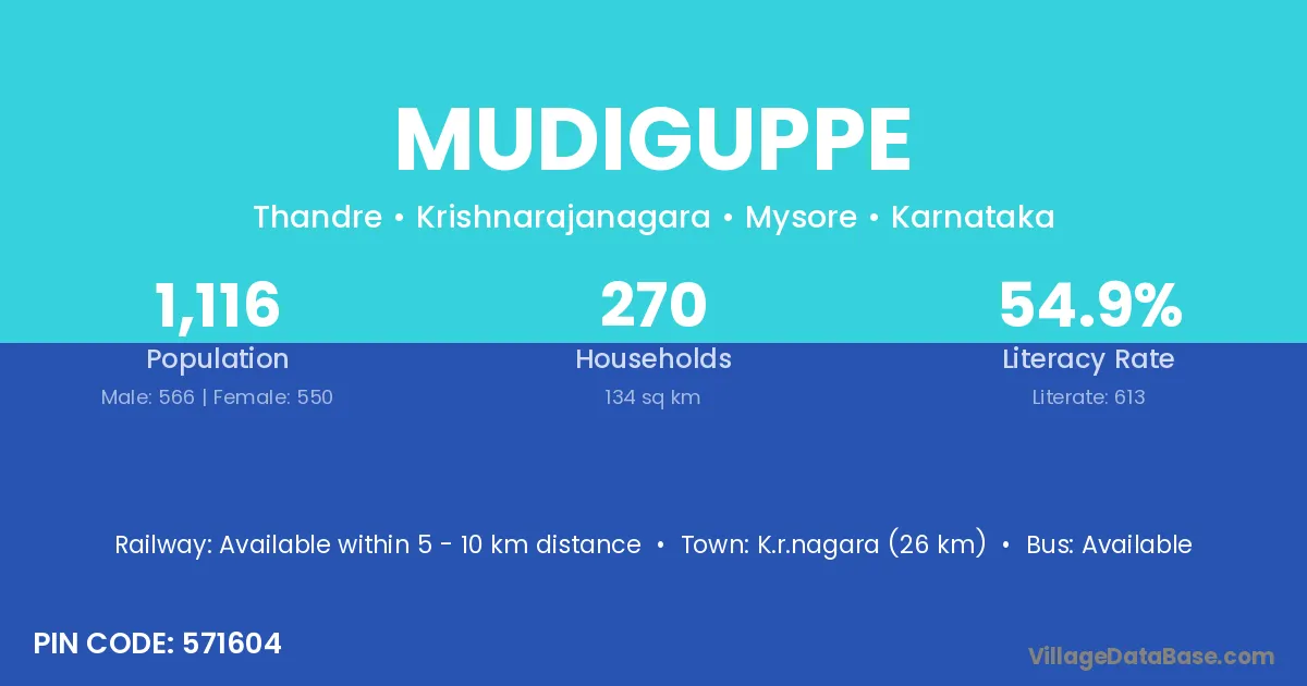 K.r.nagara (26 km) is the nearest town to Mudiguppe village for major economic activities and is located approximately 26 km away.