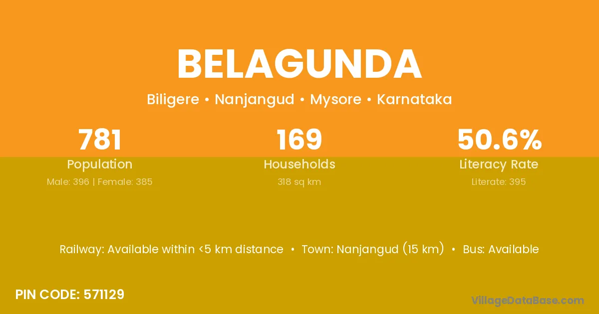 Nanjangud (15 km) is the nearest town to Belagunda village for major economic activities and is located approximately 15 km away.