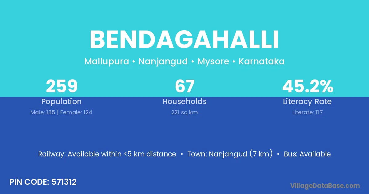 Nanjangud (7 km) is the nearest town to Bendagahalli village for major economic activities and is located approximately 7 km away.