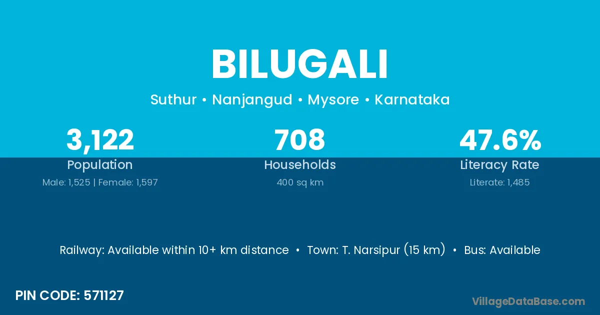T. Narsipur (15 km) is the nearest town to Bilugali village for major economic activities and is located approximately 15 km away.