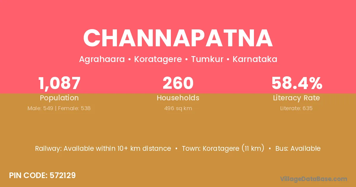 The literacy rate of Channapatna village is 50.24%. Male literacy stands at 58.14% and female literacy at 42.29%.