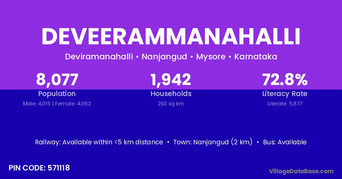 Nanjangud (2 km) is the nearest town to Deveerammanahalli village for major economic activities and is located approximately 2 km away.