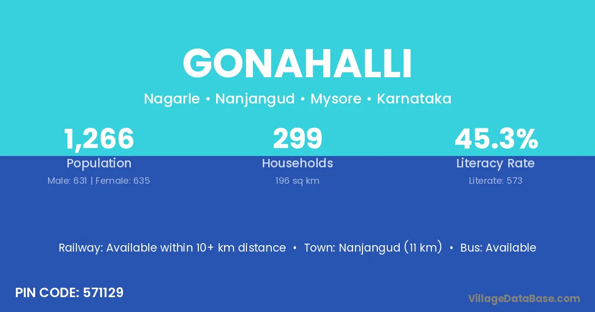 Nanjangud (11 km) is the nearest town to Gonahalli village for major economic activities and is located approximately 11 km away.