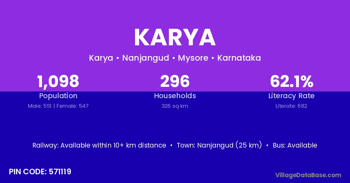 Nanjangud (25 km) is the nearest town to Karya village for major economic activities and is located approximately 25 km away.