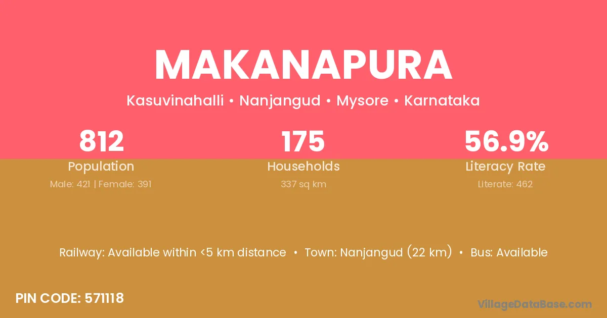 Nanjangud (22 km) is the nearest town to Makanapura village for major economic activities and is located approximately 22 km away.