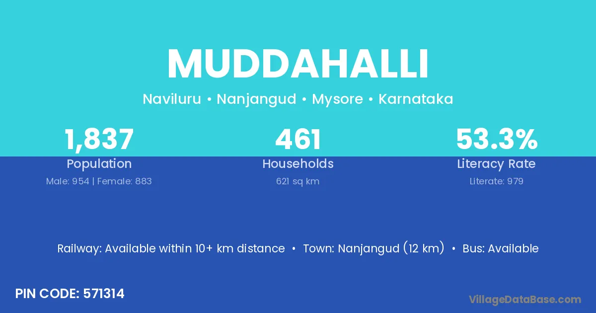 Nanjangud (12 km) is the nearest town to Muddahalli village for major economic activities and is located approximately 12 km away.