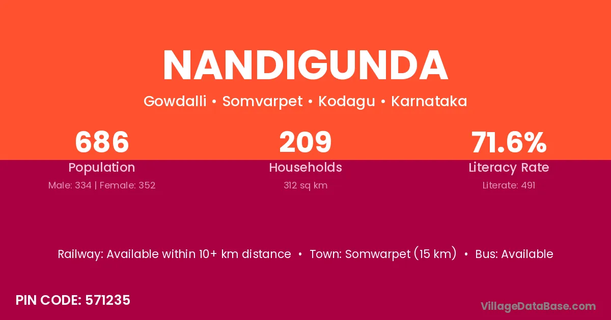 Mysore (21 km) is the nearest town to Nandigunda village for major economic activities and is located approximately 21 km away.