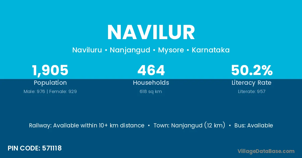 Nanjangud (12 km) is the nearest town to Navilur village for major economic activities and is located approximately 12 km away.