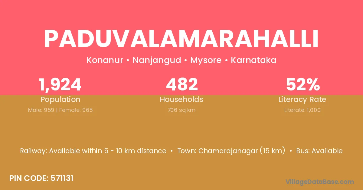 Chamarajanagar (15 km) is the nearest town to Paduvalamarahalli village for major economic activities and is located approximately 15 km away.