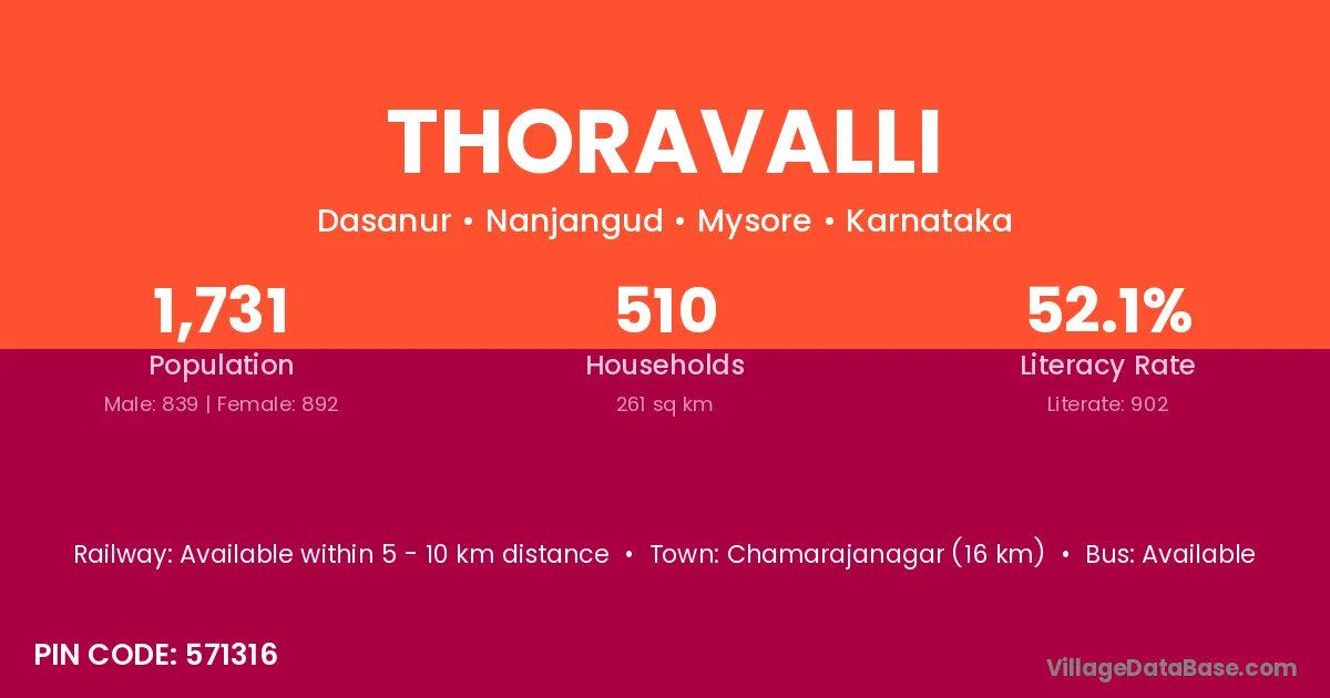 Chamarajanagar (16 km) is the nearest town to Thoravalli village for major economic activities and is located approximately 16 km away.