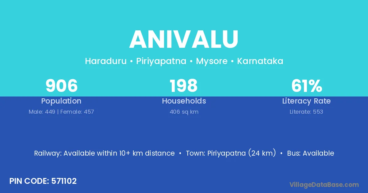 Piriyapatna (24 km) is the nearest town to Anivalu village for major economic activities and is located approximately 24 km away.