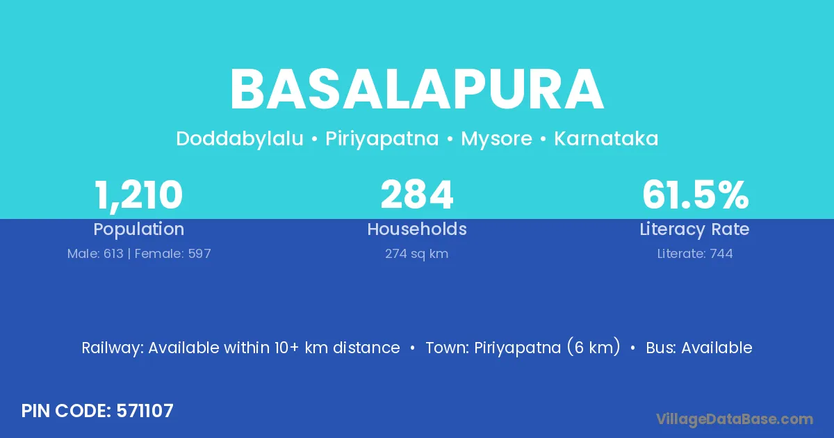 Piriyapatna (6 km) is the nearest town to Basalapura village for major economic activities and is located approximately 6 km away.