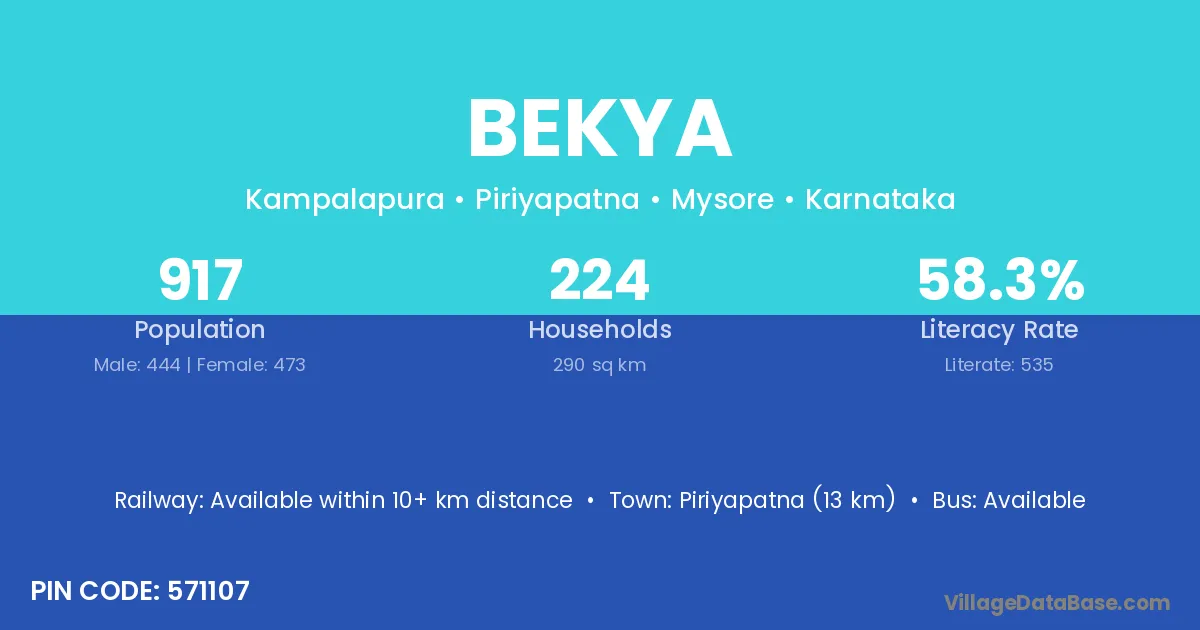 Piriyapatna (13 km) is the nearest town to Bekya village for major economic activities and is located approximately 13 km away.