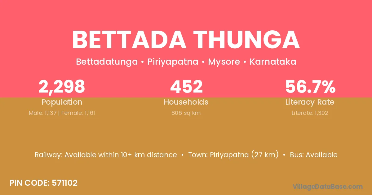 Piriyapatna (27 km) is the nearest town to Bettada Thunga village for major economic activities and is located approximately 27 km away.