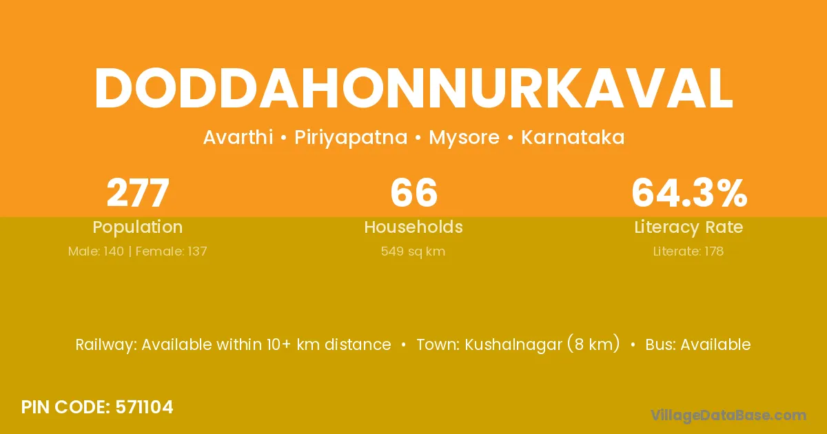 Kushalnagar (8 km) is the nearest town to Doddahonnurkaval village for major economic activities and is located approximately 8 km away.