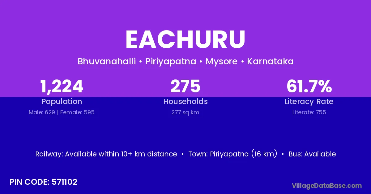 Piriyapatna (16 km) is the nearest town to Eachuru village for major economic activities and is located approximately 16 km away.