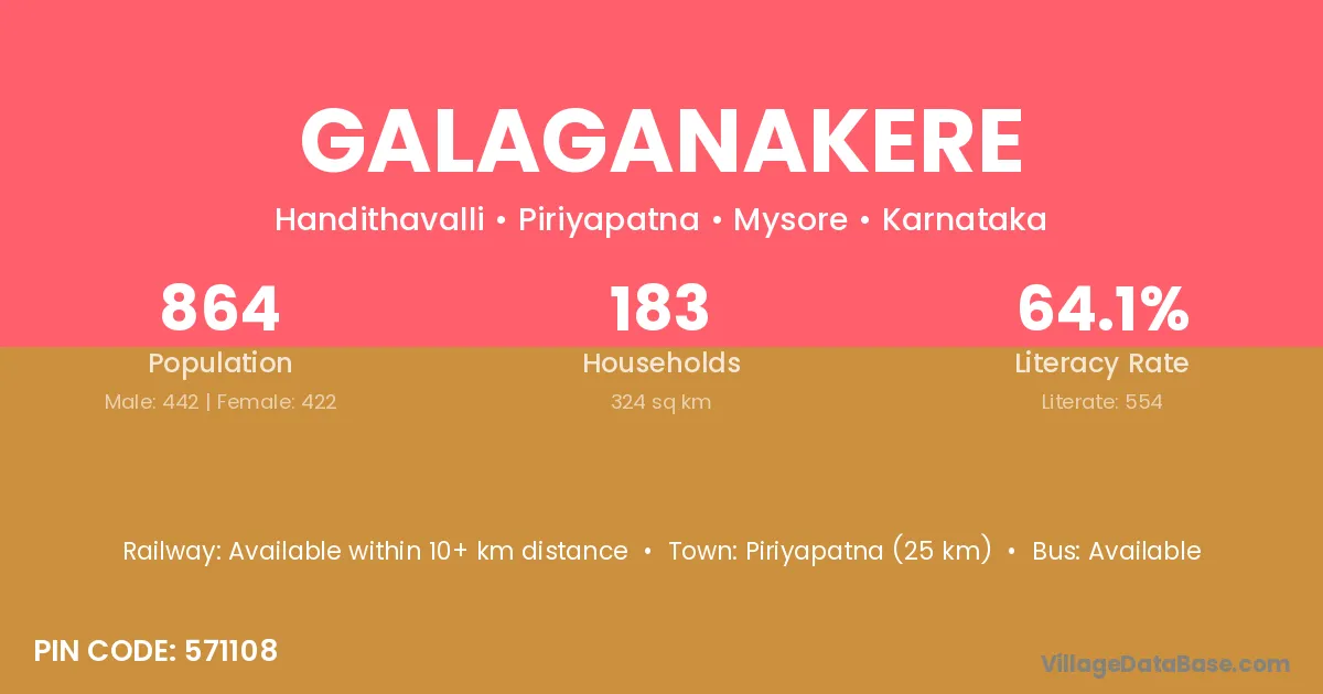 Piriyapatna (25 km) is the nearest town to Galaganakere village for major economic activities and is located approximately 25 km away.