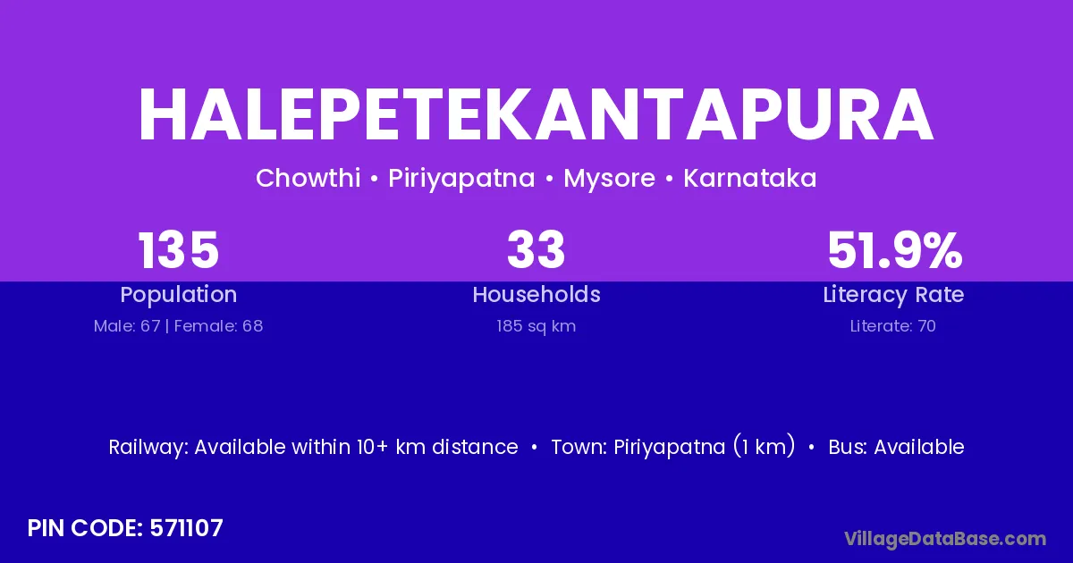 Piriyapatna (1 km) is the nearest town to Halepetekantapura village for major economic activities and is located approximately 1 km away.