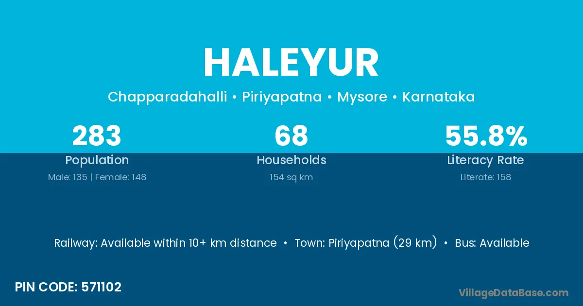 Piriyapatna (29 km) is the nearest town to Haleyur village for major economic activities and is located approximately 29 km away.
