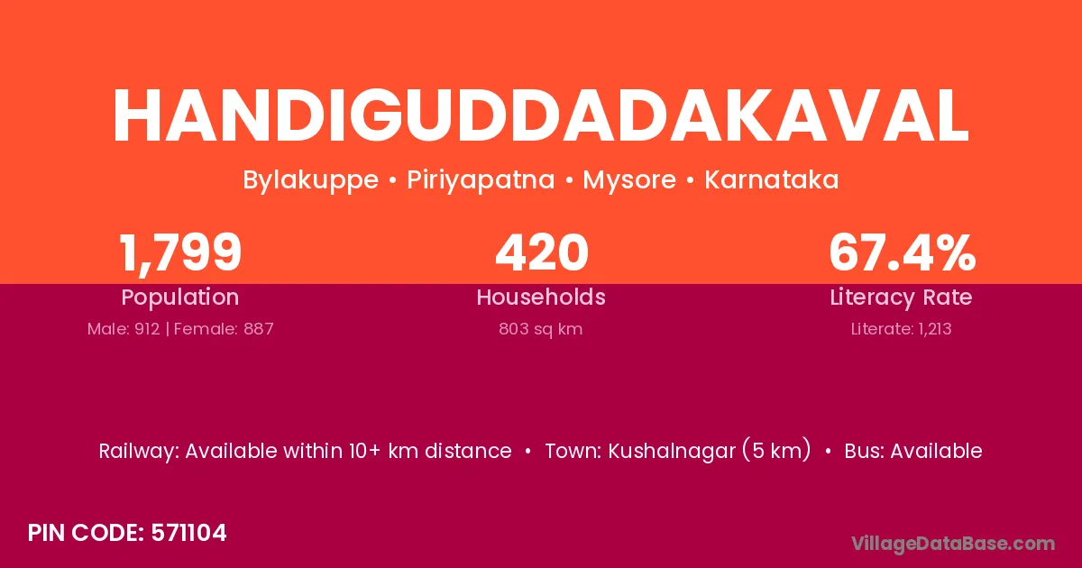 Kushalnagar (5 km) is the nearest town to Handiguddadakaval village for major economic activities and is located approximately 5 km away.