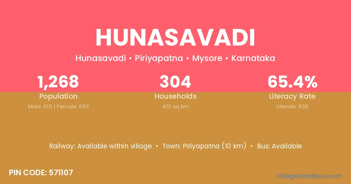 Hunasavadi village has a total population of 1,268 people, of which 615 are males and 653 are females.