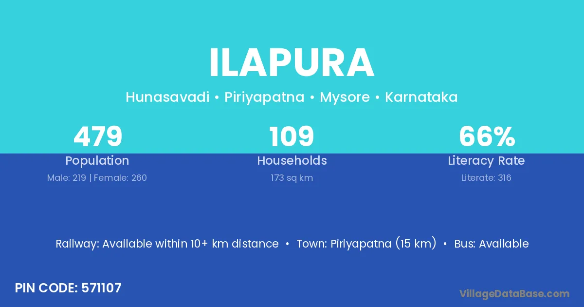 Piriyapatna (15 km) is the nearest town to Ilapura village for major economic activities and is located approximately 15 km away.