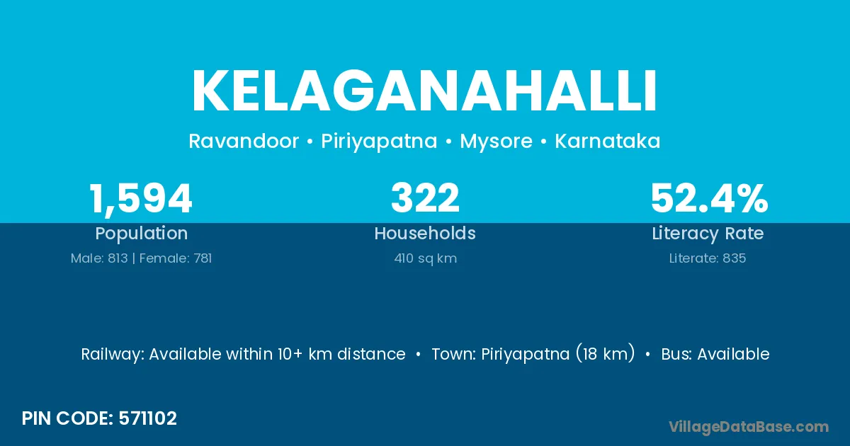 Piriyapatna (18 km) is the nearest town to Kelaganahalli village for major economic activities and is located approximately 18 km away.