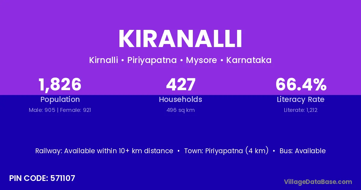 Piriyapatna (4 km) is the nearest town to Kiranalli village for major economic activities and is located approximately 4 km away.